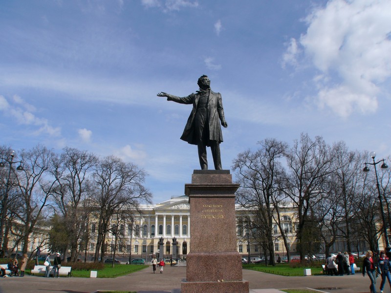В Санкт-Петербурге много памятников, посвященных великому поэту А.С. Пушкину. Один из красивейших находится на площади Искусств возле Русского музея в сквере. Скульптура, изготовленная из бронзы и высотой более 4м., помещается на высоком гранитном постаменте. Фигура поэта изображена устремленной